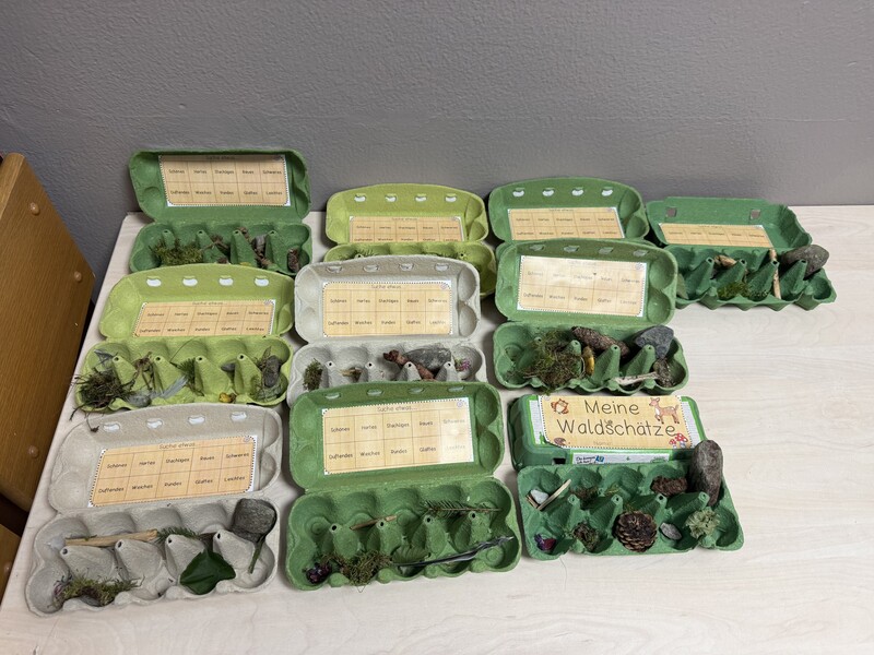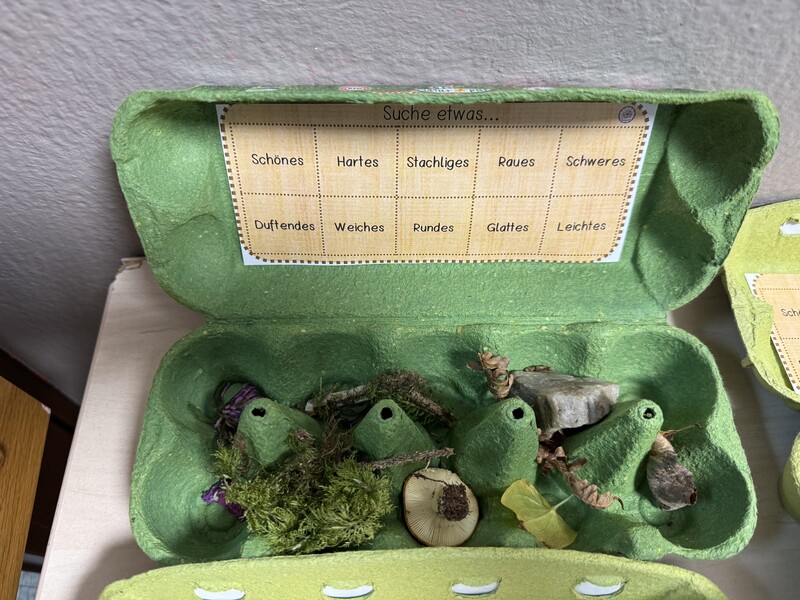 Am Anfang war es gar nicht so einfach, doch mit der Zeit schafften es alle Gruppen, die Eierkartons mit den richtigen Waldfunden zu bestücken.