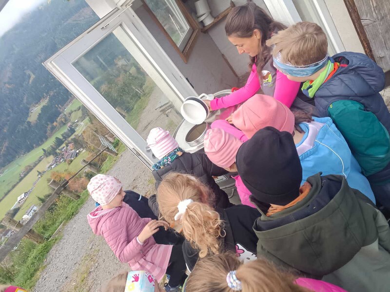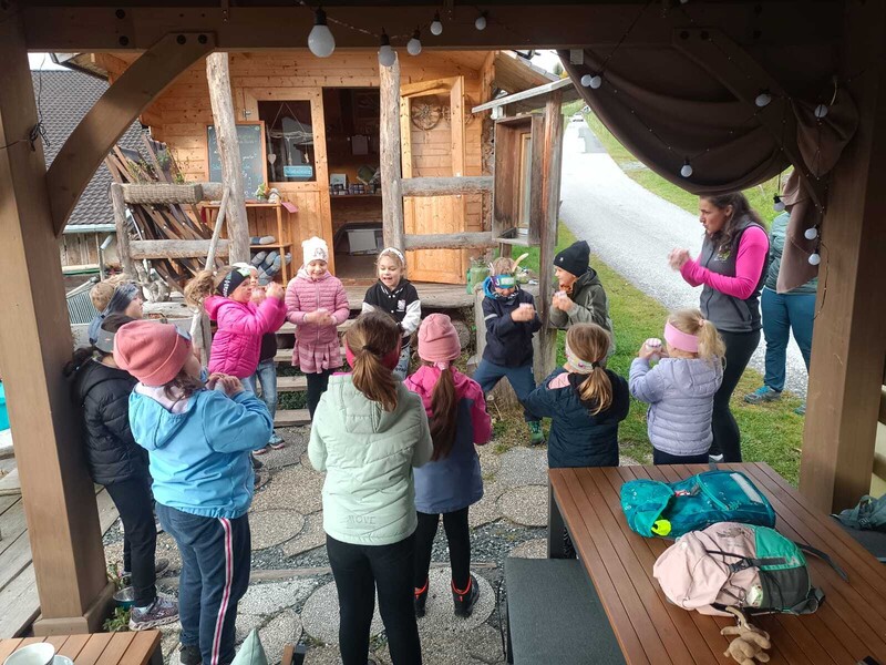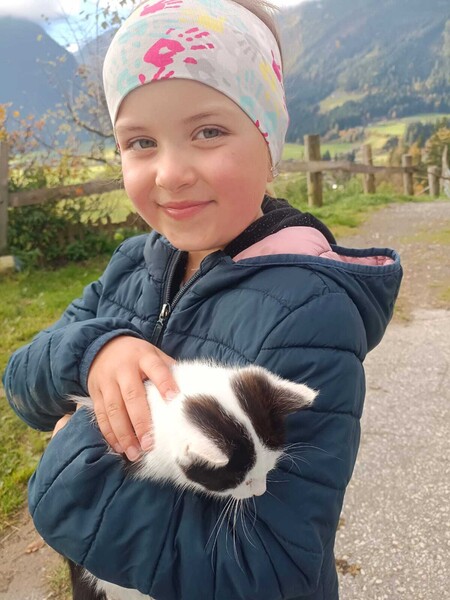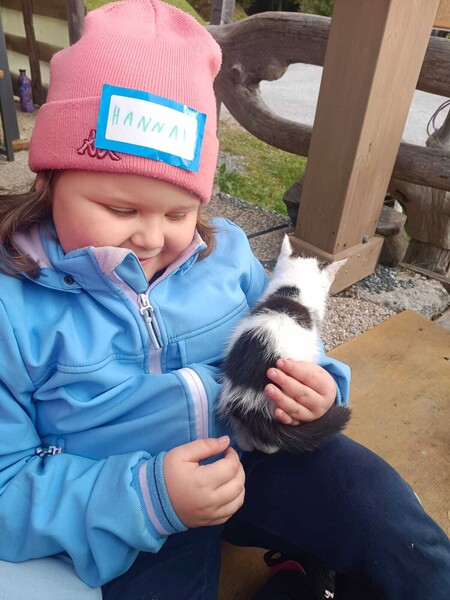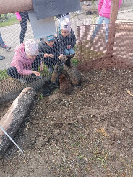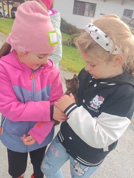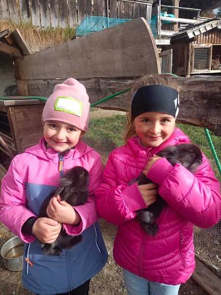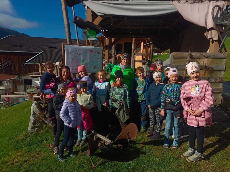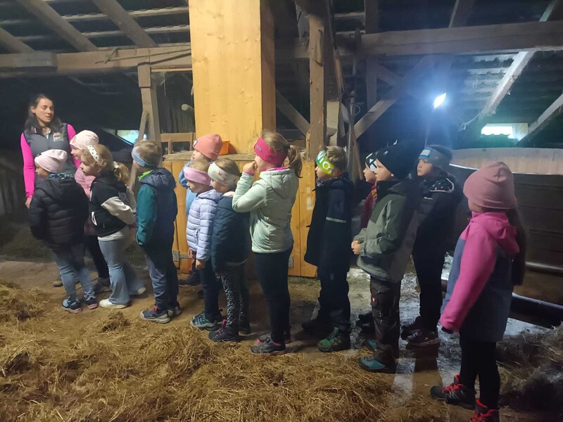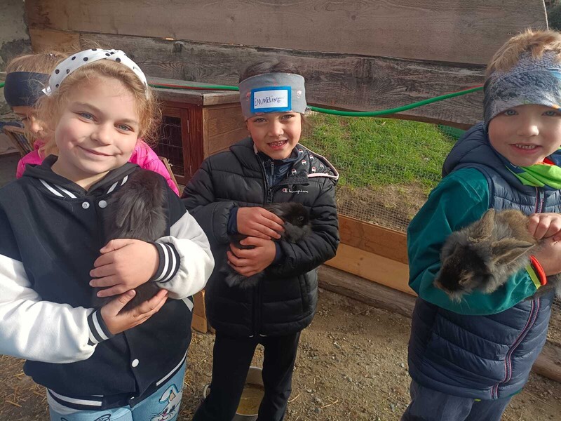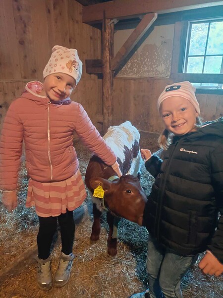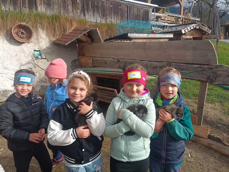 Am Hof angekommen, wurden wir von der Bäuerin herzlich empfangen. Mit viel Begeisterung erzählte sie uns von den Tieren, die dort leben, und führte uns durch den Stall. Wir durften Kühe, Kälber, Hasen, Hasenbabys und sogar kleine Babykatzen sehen – das war für viele Kinder ein echtes Highlight.