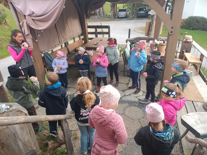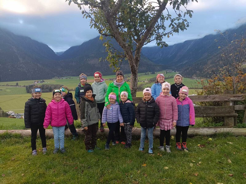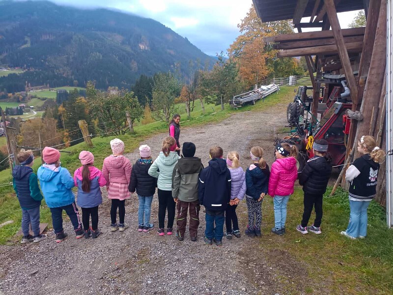 Dankenswerterweise wurden wir mit dem E-Liner bis zum Abelhof gebracht – von dort aus ging es zu Fuß weiter zum Bauernhof. Schon der kleine Spaziergang durch die frische Herbstluft machte richtig Spaß.Unterwegs gab es sogar etwas Besonderes zu entdecken: eine echte Schlangenhaut! Das sorgte natürlich für großes Staunen und viele neugierige Fragen.