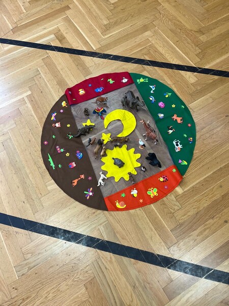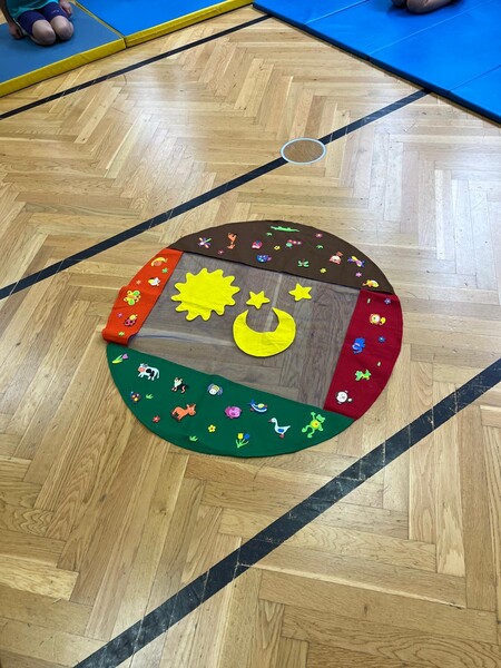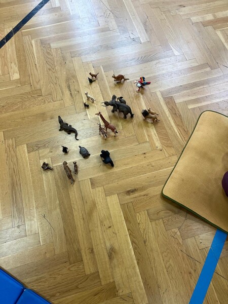 Sie hatte ein Körbchen voller Schleich-Tiere mit, von denen sich die Kinder welche aussuchen und in den aufgelegten „Mandala-Zoo“ stellen durften. Nach einer aufregenden „Zugfahrt“ und einem kurzen Spaziergang (= Aufwärmen) haben wir dann die einzelnen Tiere im Zoo besucht und yogamäßig umgesetzt . Da gab es dann Übungen zu: Giraffen, Löwen, Tiger, Pinguinen, Krokodilen, Hunden, Katzen, Kranichen, Papageien auf dem Baum,…. Zum Abschluss durften sich alle noch einmal richtig entspannen und bekamen – wer wollte – einen Yogapunkt auf die Stirn gemalt.